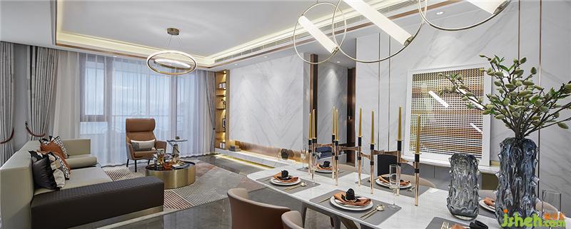 客廳空間的設(shè)計(jì),通過塊面和線條的塑造使其更具包容性。天花設(shè)計(jì)不銹鋼疊級與墻面豎向的不銹鋼收邊,突顯了空間的層次感與立體感。白色大理石增設(shè)嵌入式展示柜,使空間更為整體大氣。