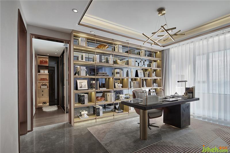 設(shè)計(jì)書房為開敞式書房,與客廳連貫,增大了住戶的感官面積,也滿足了日常生活需求,提升住宅品質(zhì)。樣板房設(shè)計(jì)