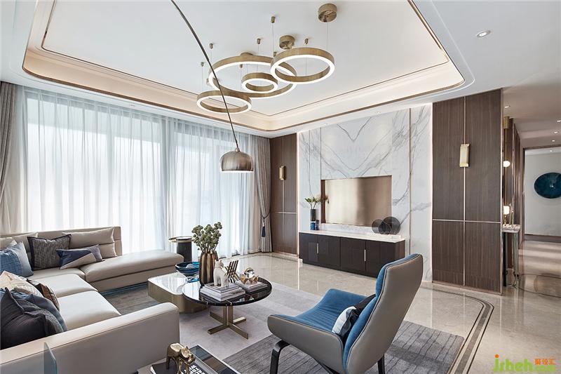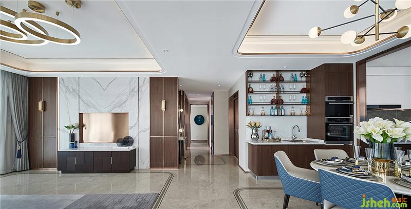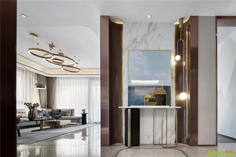 運用一整塊白色天然紋理石材用作背景墻,不局限于普通的奢侈,展示石材純天然的肌理,使空間得到自然的內(nèi)斂和沉淀。墻面深色木飾面與金屬嵌條的結(jié)合,簡潔大方且細節(jié)精致,石材地面用簡潔的拼花,香檳金不銹鋼的嵌入,突出品質(zhì)生活細節(jié)。大量使用亞光面、皮革、茶色金屬以及布藝軟裝,配合素色材質(zhì),融入國際化的設(shè)計手法,強調(diào)精英品味的同時,著力打造空間的舒適性與實用性。樣板房設(shè)計