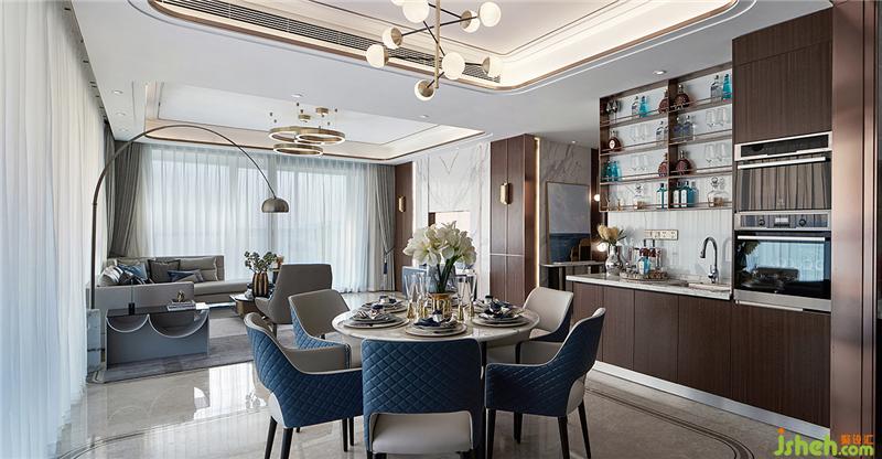 整面落地窗的形式,配以南北通的客餐廳空間布置,開闊了居住者的視覺感受,全大理石地面,突出居住品質(zhì)及生活質(zhì)量,中西廚的設(shè)置,配上圓桌的設(shè)計,不僅給一家人提供了生活的樂趣,更給居住者提供了聚會交流的場地,使居住者更能體會到尊享感。樣板房設(shè)計