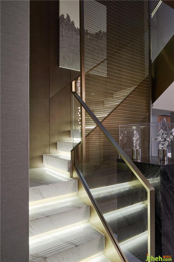 樓梯裝置以通頂金屬網為隔斷,視線未被完全阻隔,客餐廳與景觀陽臺隱約窺見。整個門廳收放有序,以東方理念的當代演繹,將喧囂褪去,讓所有感官在靜謐中自由舒緩。