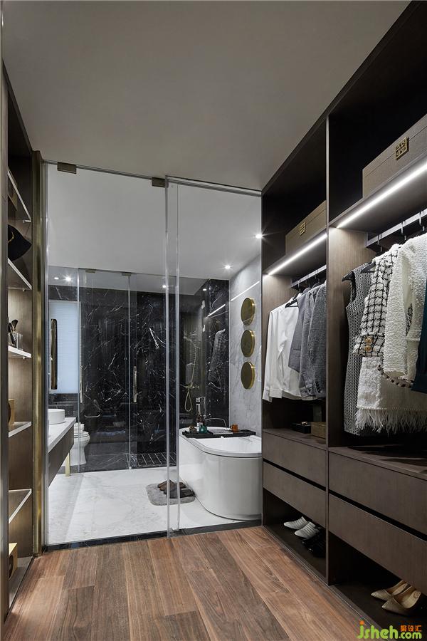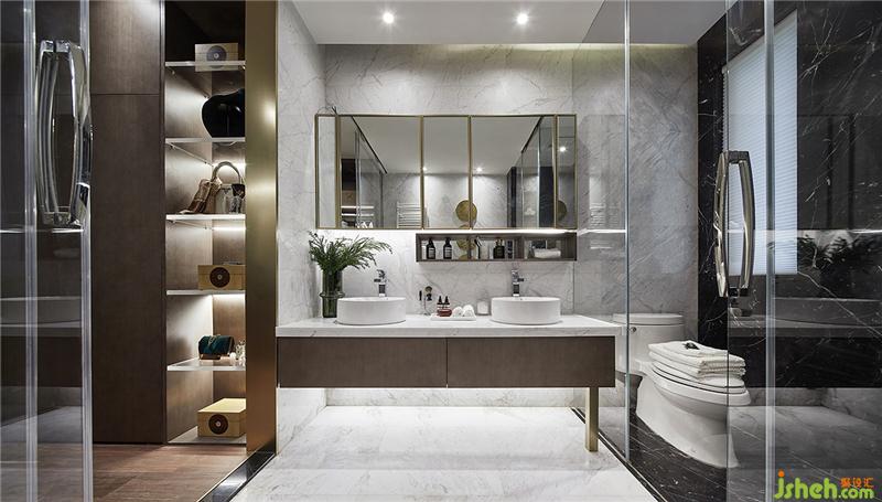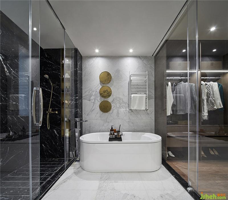 爵士白、黑白根大理石與古銅拉絲不銹鋼的搭配相得益彰,對比鮮明,散發(fā)出通透簡約的高貴質感。