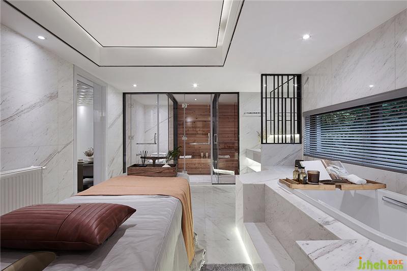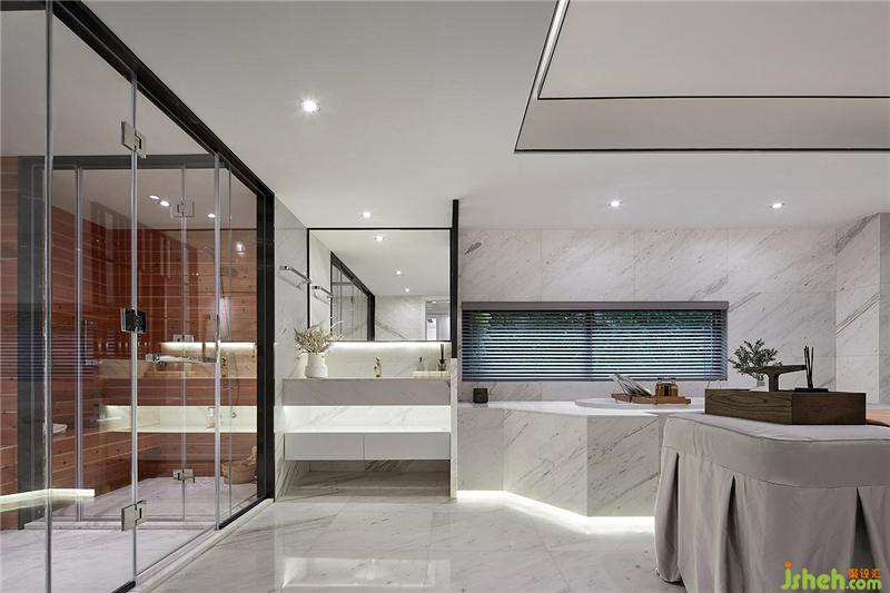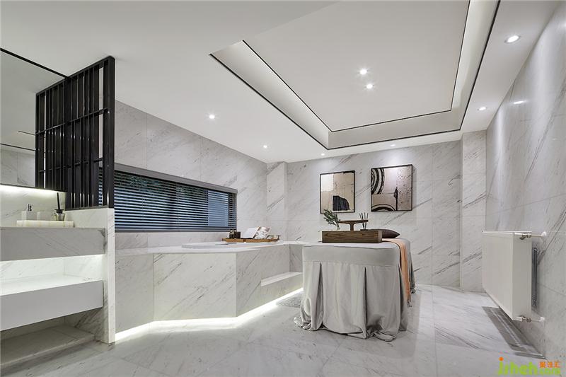 SPA區(qū)的設(shè)計依然延續(xù)白色的主色調(diào),白色大理石材質(zhì)和黑色鑲邊相互映襯,賦予空間低調(diào)奢華的魅力,彰顯高級品味。