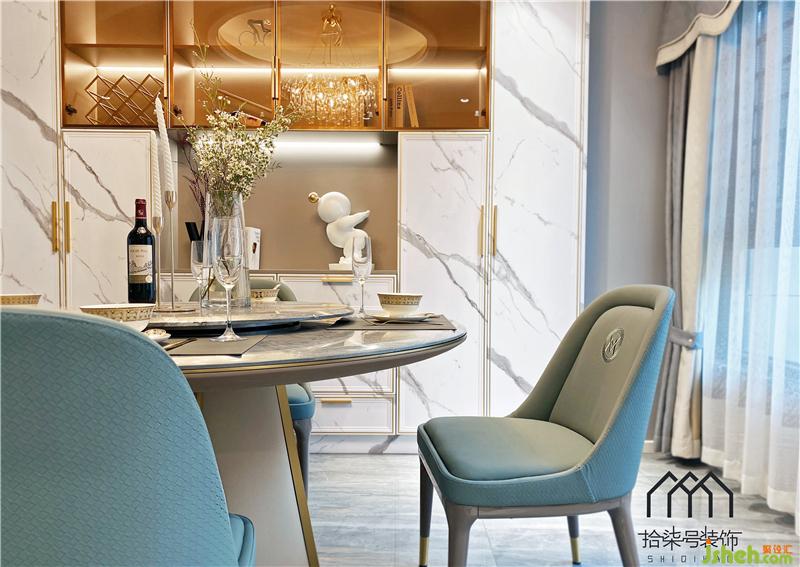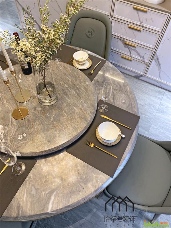 深灰綠的餐椅,與大理石的灰和諧相處。
