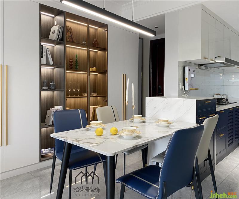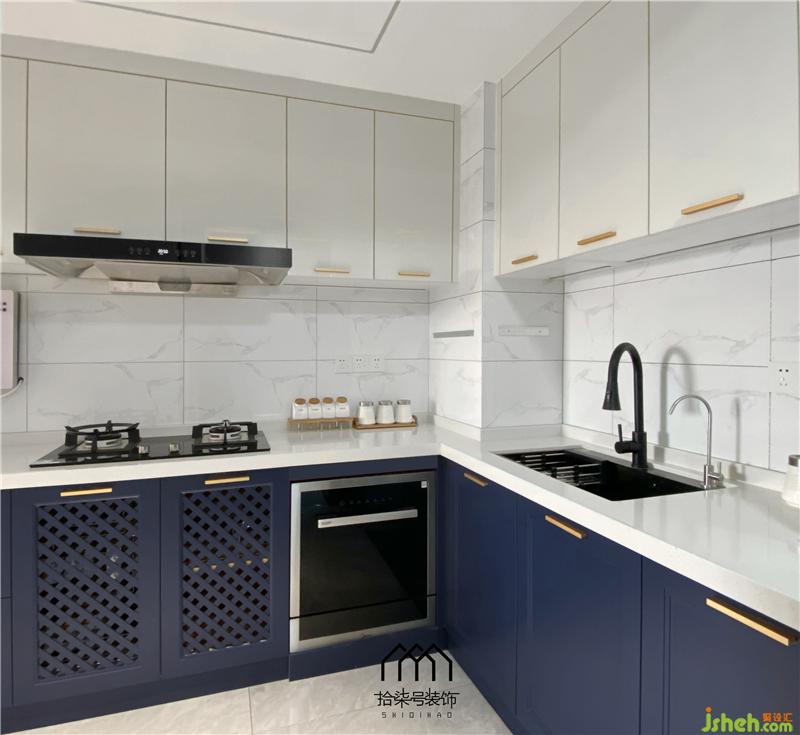 廚房與原有的小陽(yáng)臺(tái)打通增加使用空間,餐廳增加島臺(tái)使用起來(lái)更加合理便利。柳州家居裝修半開放式廚房提高家人之間的互動(dòng),藍(lán)白色調(diào)更突出浪漫氣息。
