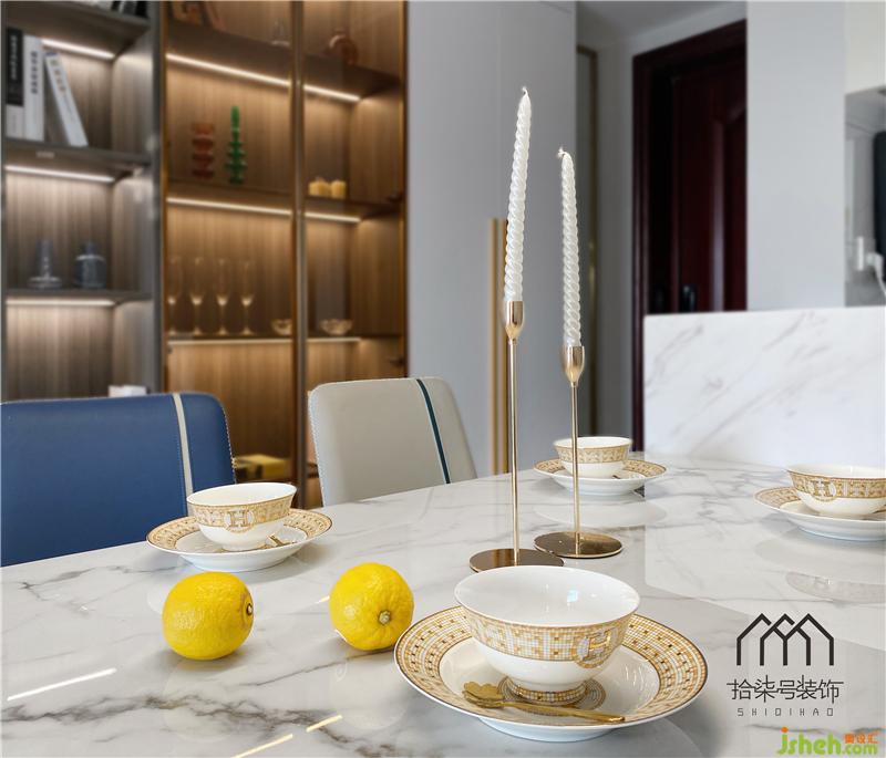 餐廳結(jié)合島臺(tái)形式,入戶裝飾柜增加收納空間,部分開放格劃分墻面更有層次感。