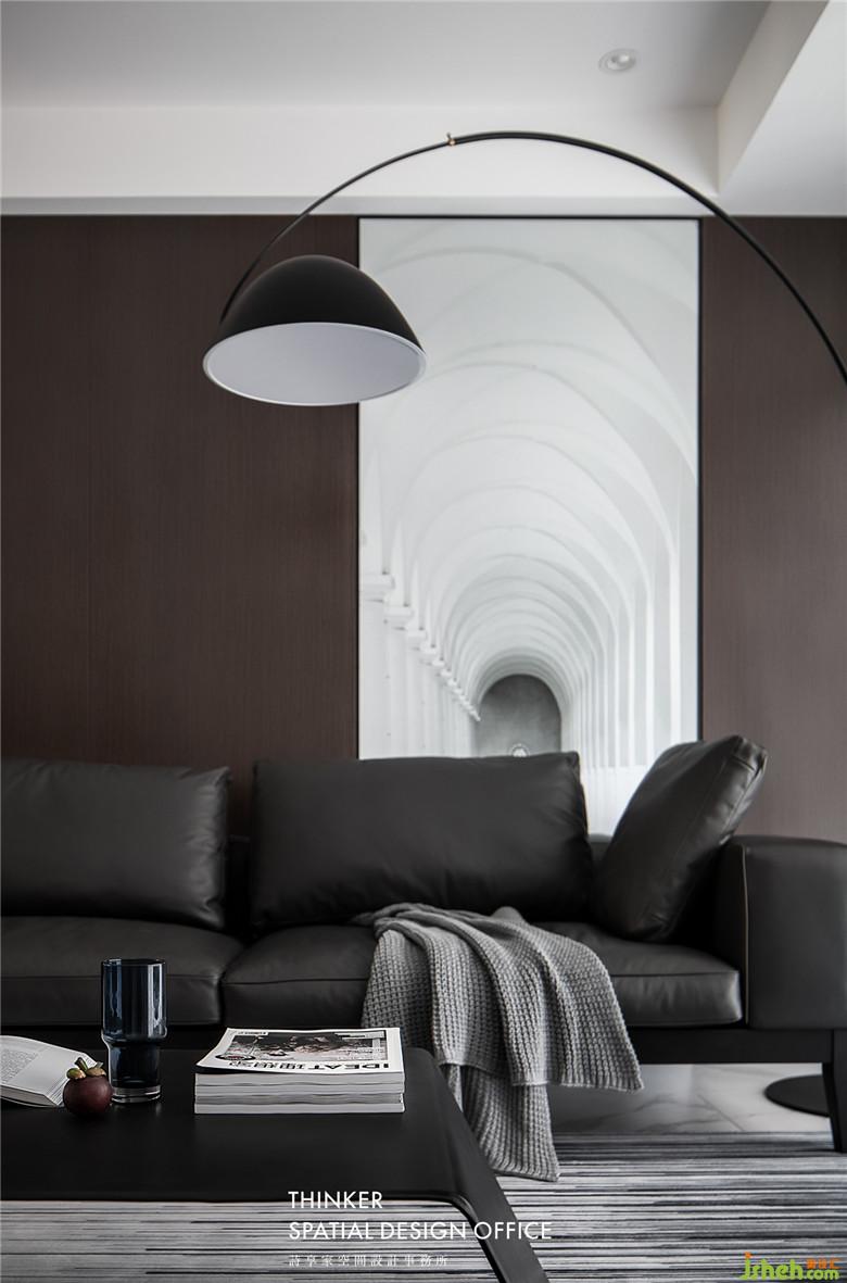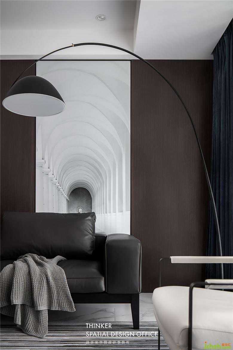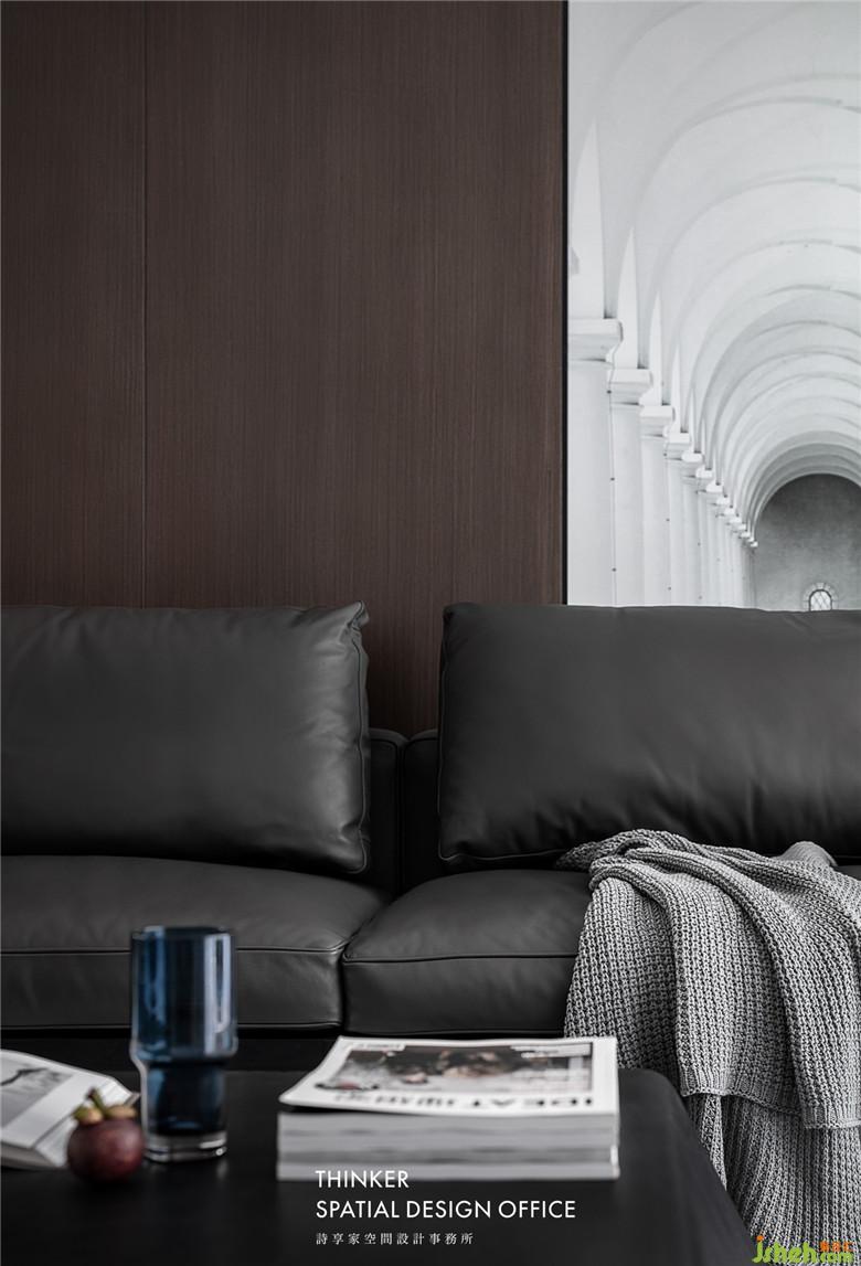 家具款式簡約明了,沙發(fā)皮革的質感與墻面黑胡桃木紋碰撞,帶來硬朗卻又溫潤的時尚感;定制的建筑透視畫,產生虛實結合的視覺體驗,同時提亮了客廳的整體色調。