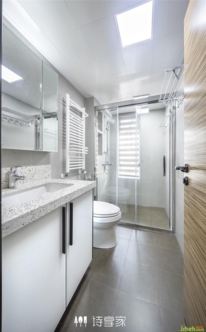 主衛(wèi)室內(nèi)設(shè)計(jì)師采用淺灰色和白色的搭配,狹長(zhǎng)的空間也顯得簡(jiǎn)潔、通透。