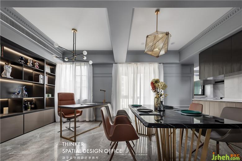 室內(nèi)設(shè)計(jì)師吊頂?shù)脑O(shè)計(jì),減弱了梁體帶來的突兀感,也與客廳呼應(yīng),和諧統(tǒng)一。定制書桌與陽臺(tái)門也連成一體,選擇同樣的金屬材質(zhì),甚至陽臺(tái)門也定制了2cm的不銹鋼門框,只為保持風(fēng)格的一致性。
