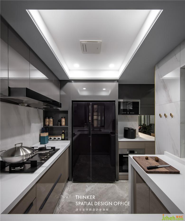 與普通廚房的平頂不同,這個(gè)廚房的吊頂延續(xù)了餐廳的造型,搭配點(diǎn)光源,非常有設(shè)計(jì)感。櫥柜選擇了烤漆門,現(xiàn)代感十足,分隔收納設(shè)計(jì)也充滿了小心機(jī),各種電器設(shè)備齊全,就算一個(gè)人住,也要好好吃飯。