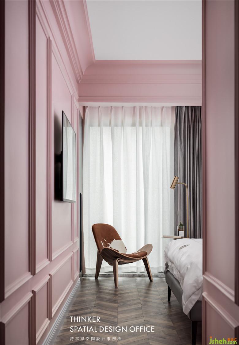 室內(nèi)設(shè)計(jì)師以灰粉色墻面包裹臥室,柔軟而溫和,床頭內(nèi)斂的灰藍(lán)色,又為空間注入沉穩(wěn)安靜的氣息,魚骨拼地板更帶來法式的優(yōu)雅。好好睡覺,很重要。
