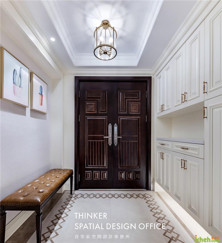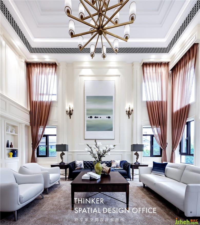 純凈的奶白色墻面,細(xì)致的線條變化帶來豐富的層次感,木質(zhì)護(hù)墻板不僅豐富了墻面造型,它溫潤的質(zhì)感也提升了空間氣質(zhì)。經(jīng)典的羅馬柱、壁爐的元素,讓挑空的客廳顯得美式風(fēng)味十足。