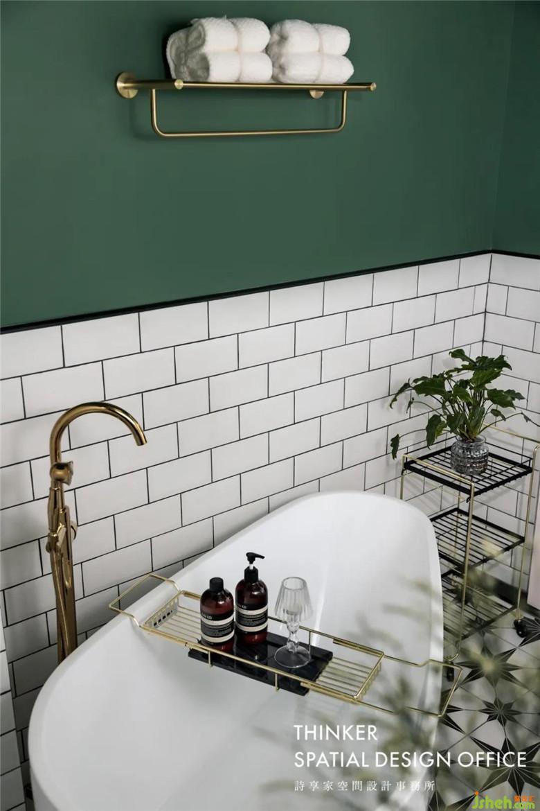 衛(wèi)生間并不大,但Shirley心心念念地想要一個(gè)有浴缸的浴室,所以特別挑選了一款小巧的蛋殼浴缸,顏值和功能兼具。同時(shí)用白色+復(fù)古綠的半墻設(shè)計(jì),清爽又摩登。