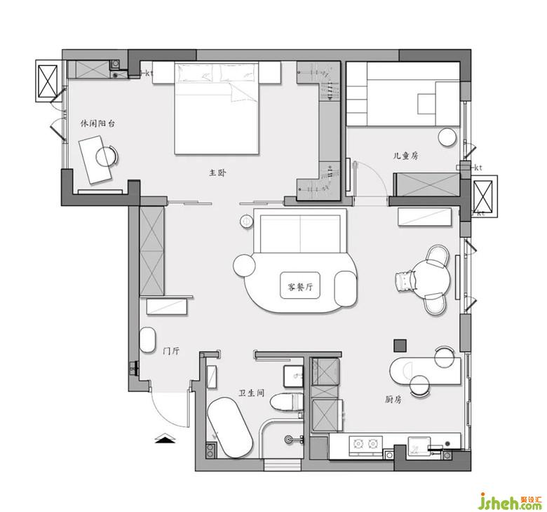 并入了陽(yáng)臺(tái)的臥室,顯得格外寬敞,而霧霾藍(lán)與磚紅色的搭配,有著更飽滿的視覺感受。