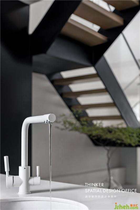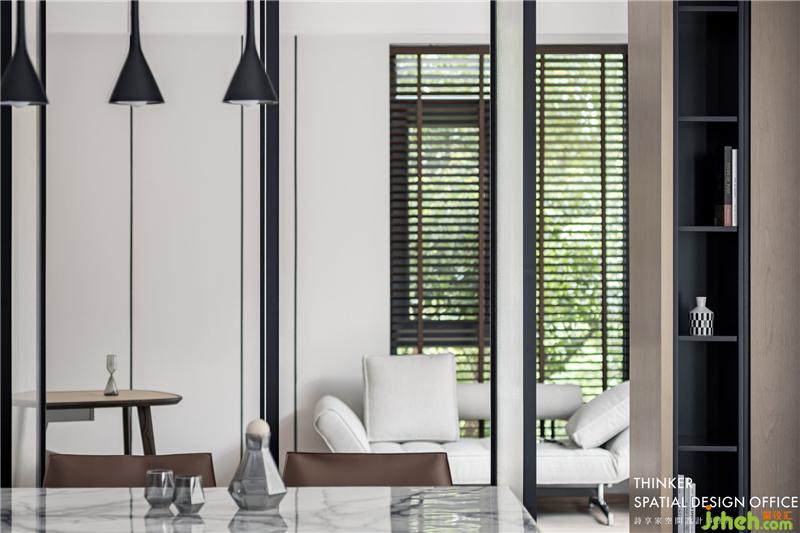 · 開放式的廚房加強了與餐廳的互動,以島臺作為隔斷減輕了視覺的厚重感。白色、黑色與原木的結合,消除了深色空間的沉悶感。