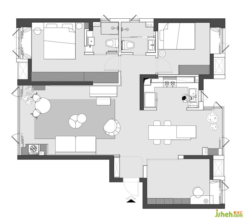 空間家居設(shè)計(jì)用大面積的高級(jí)灰打底,局部用巖板、金屬水泥漆打造體塊,柔和之中多了層次感。地面鋪設(shè)人字拼木地板,滿膠鋪貼的方式與廚衛(wèi)瓷磚無(wú)縫收口,細(xì)節(jié)更精致。