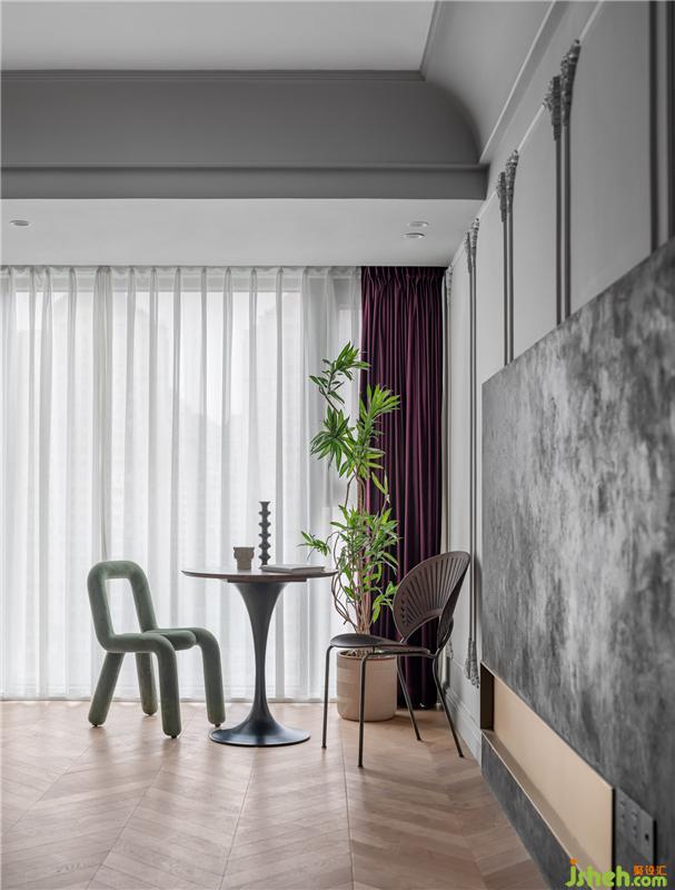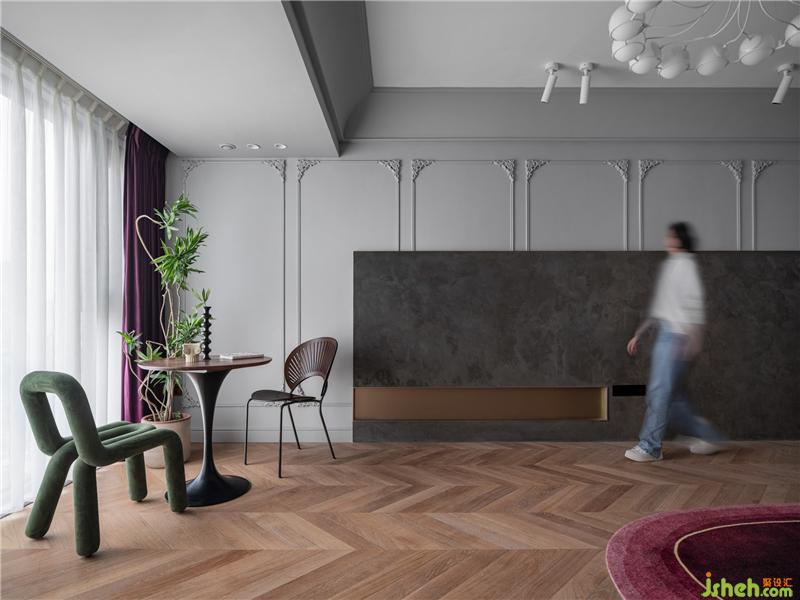家居設(shè)計(jì)背景墻采用PU線條,營(yíng)造護(hù)墻板高級(jí)效果。局部水泥灰藝術(shù)漆、拼接金屬材質(zhì),打造藝術(shù)體塊,質(zhì)感十足!Jean夫婦兩都沒(méi)有看電視的習(xí)慣,于是舍棄電視,打通陽(yáng)臺(tái)與客廳,打造時(shí)髦讀書角。