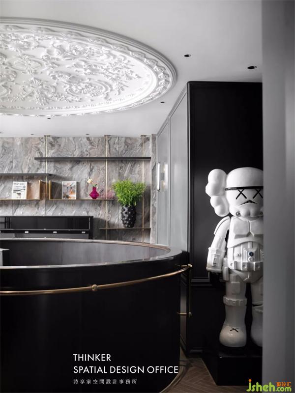 站在門口,透過玄關(guān)境的視線,我們馬上就能感受到設(shè)計(jì)師想要空間呼應(yīng)的想法。拼花地磚呼應(yīng)著旋轉(zhuǎn)樓梯,雕花立柱在現(xiàn)代設(shè)計(jì)中點(diǎn)綴出法式優(yōu)雅,而同時(shí),它們又自成一體地營造出樓梯廳的空間感。設(shè)計(jì),就該是一種系統(tǒng)而整體性的考量。