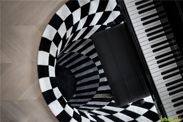 地毯的幾何元素與黑白琴鍵編制其間