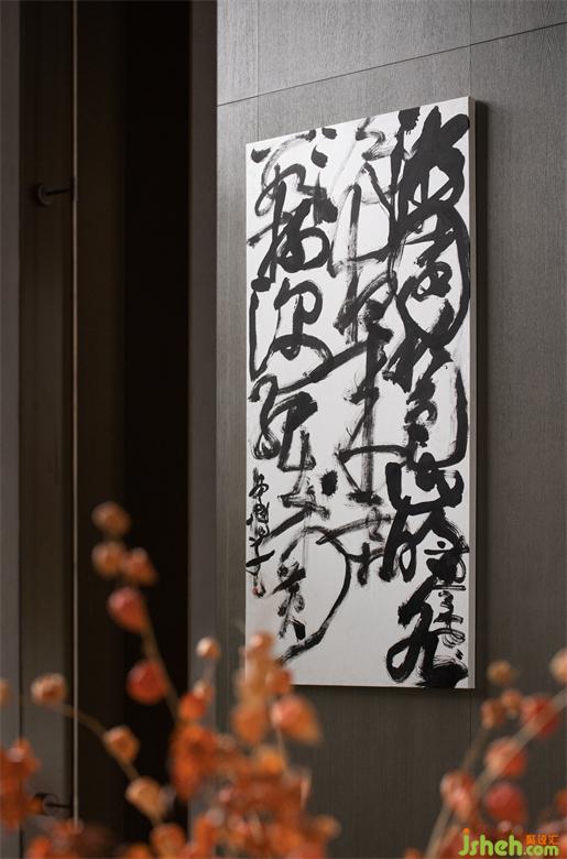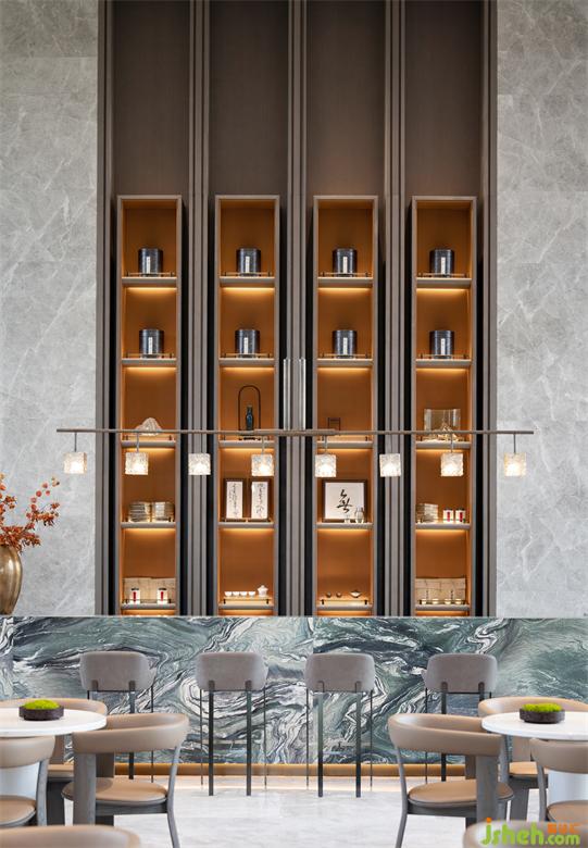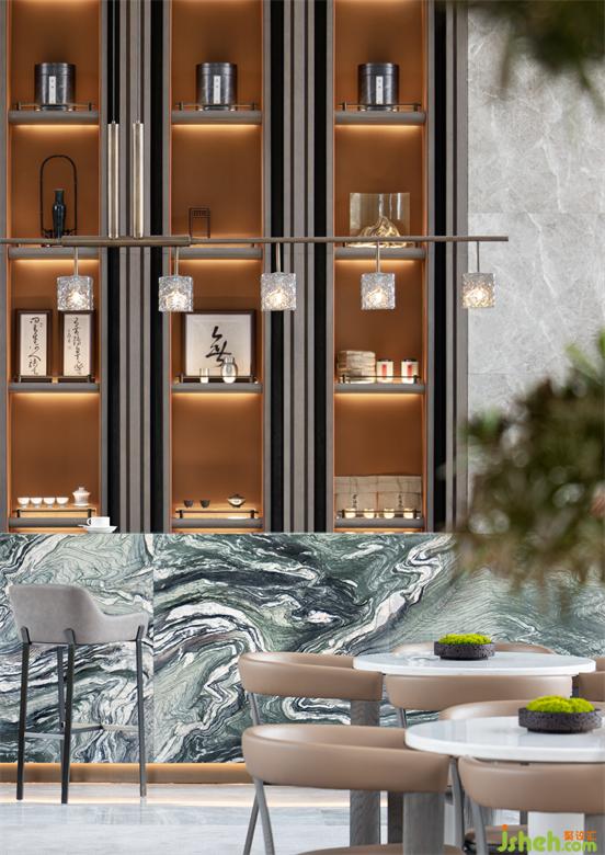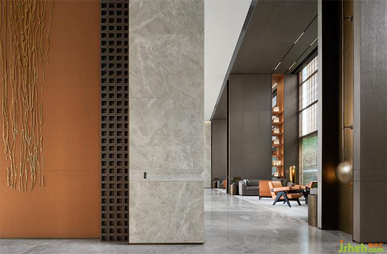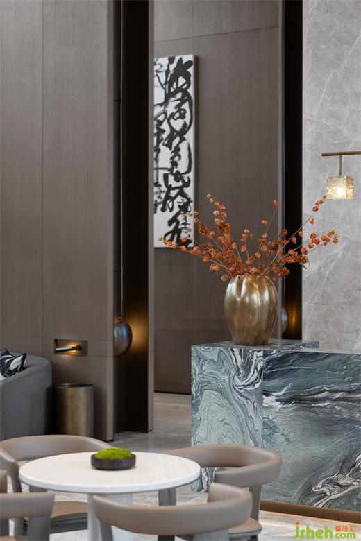 紫山水石材吧臺(tái)位于山水影壁的背面,柏悅公館營銷中心設(shè)計(jì)立于洽談區(qū)中軸的位置。立面以木紋、皮革和古銅金屬的柜體為背景,赭石色的花藝延續(xù)著空間的色彩脈絡(luò)。