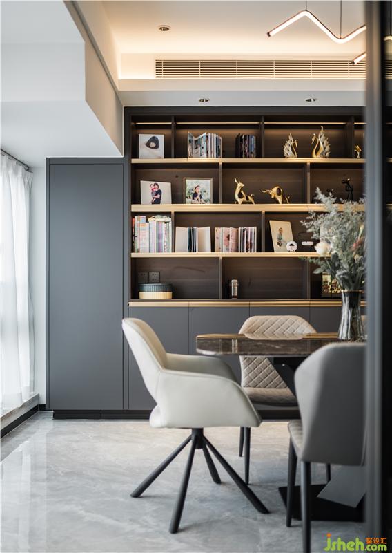 餐廳整體延續(xù)客廳風(fēng)格,加入整面的書柜,擺脫餐邊柜的刻板印象,滿足一家人有大量讀物擺放和展示需求,同時(shí)營造一個(gè)親子氛圍空間,拉近父母與小朋友的互動(dòng)。