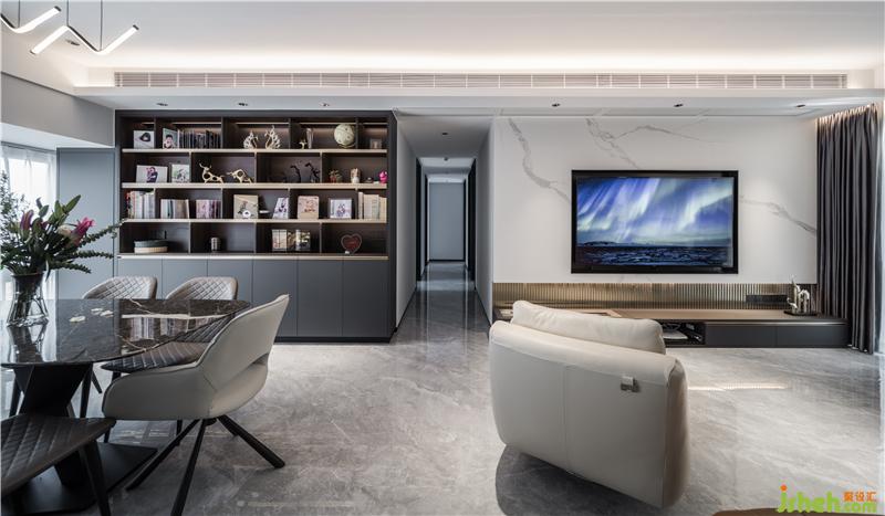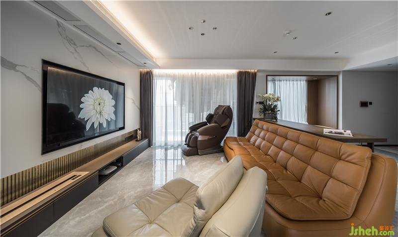對(duì)于氛圍打造也起到重要作用,天花隱藏?zé)魩I造出整個(gè)空間氣氛的細(xì)膩?zhàn)兓?。隱藏的點(diǎn)光源則作為空間主光源處理。整個(gè)空間不同體塊層疊的層次感,在材質(zhì)的選擇上以中性灰色打底,暖白調(diào)貫穿,棕色點(diǎn)綴,形成冷暖色調(diào)對(duì)立,讓一個(gè)空間中造型的繁簡(jiǎn)與材質(zhì)深淺進(jìn)行節(jié)奏對(duì)話,不讓定義風(fēng)格干擾空間的想象力。