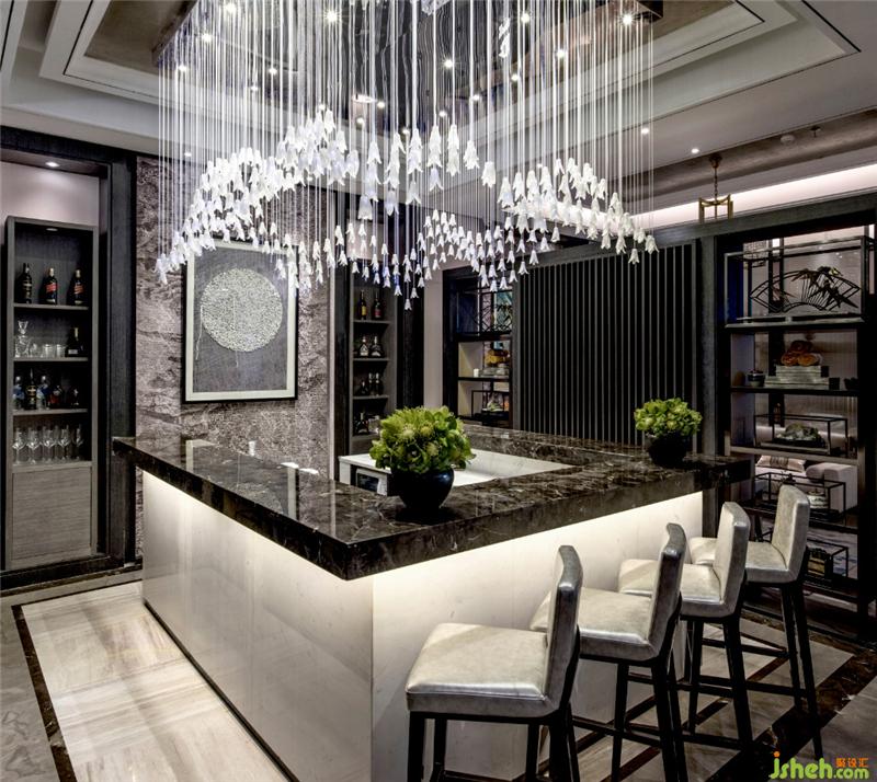 水吧臺處,吊燈采用三面小花瓣組合而成。運用概括提煉的方式,增強空間的形式感,利用線性陣列傳達出前衛(wèi)的時代氣質(zhì)。