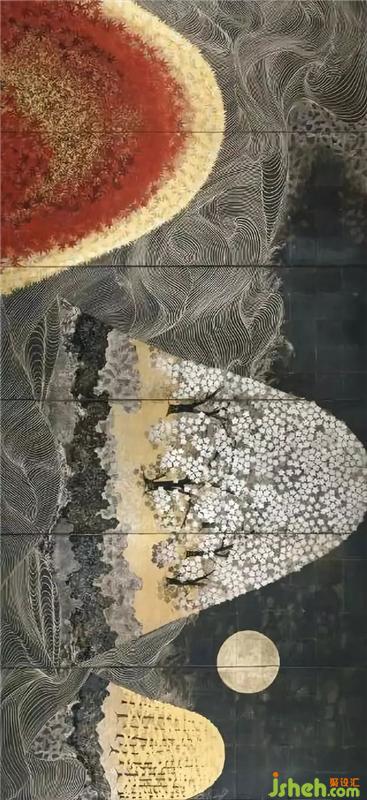 加山又造的著名作品《千羽鶴》在構(gòu)圖上取長橫式,左右有較大的日與月的意象,背景是一種翻涌的浪紋,恍然是海浪,結(jié)合日月意象,放佛又是處于天上的銀河中,在這種朦朧的,動(dòng)蕩的漩渦暗涌的背景下,成群的鶴影有序成隊(duì)的飛行,被畫者組織得很有節(jié)奏感。在藝術(shù)手法上,增添了一些現(xiàn)代感,簡明與細(xì)致結(jié)合,細(xì)謹(jǐn)而明晰。