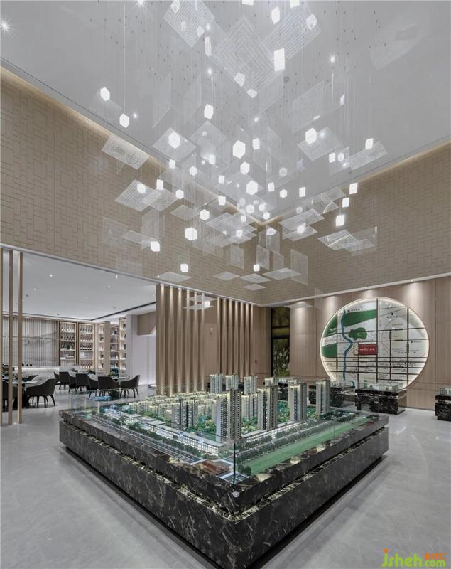 沙盤區(qū)一組大型白色藝術(shù)裝置吊燈映入眼簾,亞克力片裝置形成虛實(shí)相間的韻律感,喚醒空間的靈魂,尤其在墻壁棕色木質(zhì)材料的襯托下顯得格外明朗有力,形成強(qiáng)烈的反差與對比。無論從光影,顏色還是材質(zhì),都在著力營造一種空間的延伸,既相互依托又各有千秋。會所設(shè)計