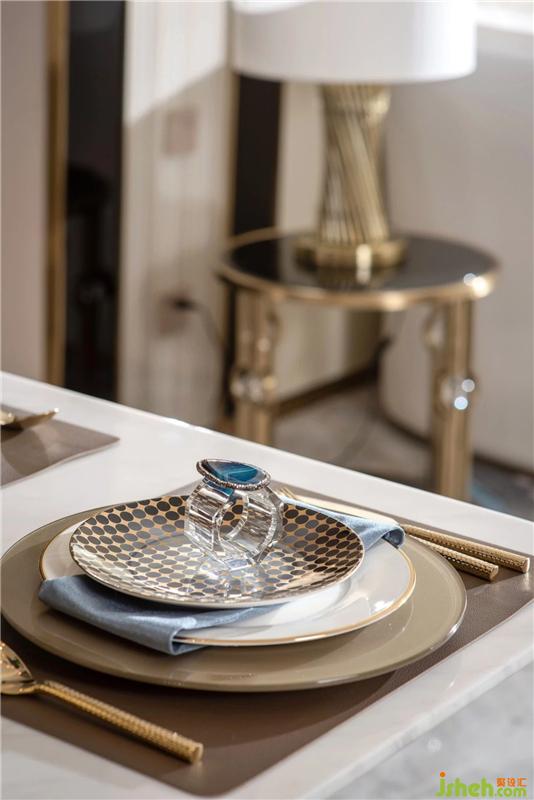 餐桌花藝以及餐具點綴寶石藍(lán),與主題相呼應(yīng)。以豐饒的創(chuàng)意表達(dá)生活內(nèi)涵和當(dāng)代氣質(zhì),將空間具化為實用與美學(xué)交織相融的生命體,賦予空間輕奢、雅致而舒適的生活氛圍。