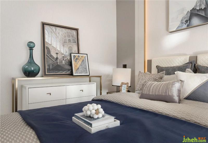 次臥空間繼續(xù)延伸藍(lán)色元素,與現(xiàn)代裝飾畫相得益彰、交相輝映外,白色的幾何線條、輕體量的功能性軟裝搭配,讓整體空間不失層次感。