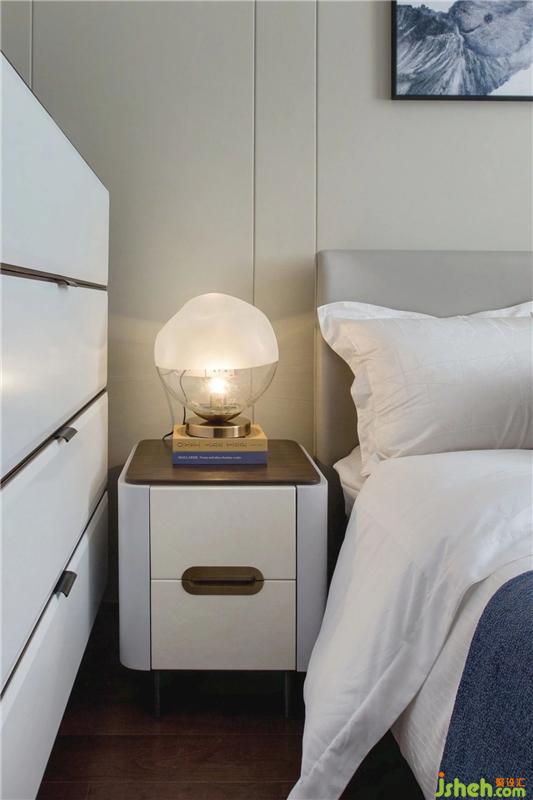 次臥的冷色床品與墻面、掛畫相搭配,乳白色柜體有了棕色的裝飾條,光源的暖色也不會(huì)顯得突兀。
