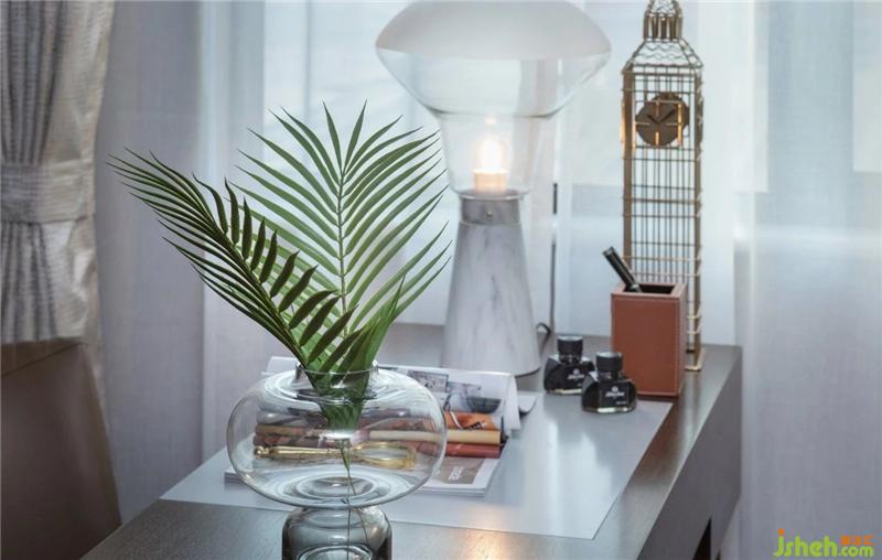 The cool-colored bedding of the second bedroom is matched with the wall and the hanging picture. The milky white cabinet has a brown decorative strip, and the warm color of the light source will not appear abrupt.