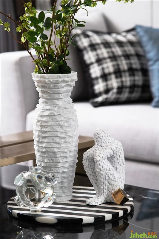 餐廳的四人位采用拼色的設(shè)計(jì),在統(tǒng)一中尋求變化,裝飾畫選擇了面料褶皺的藝術(shù)處理,色調(diào)與花藝,餐椅整個(gè)的色彩相呼應(yīng),營(yíng)造出居家用餐時(shí)刻的和諧氛圍。戶型針對(duì)的是40歲左右的客戶群體,定位為冷色調(diào)的精英家庭,現(xiàn)代輕奢風(fēng)格,強(qiáng)調(diào)雅居生活。