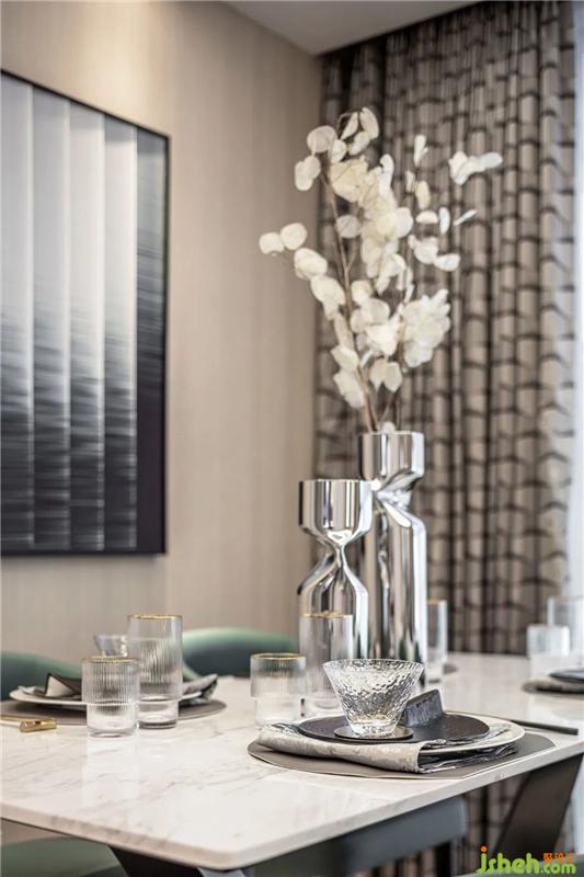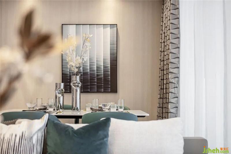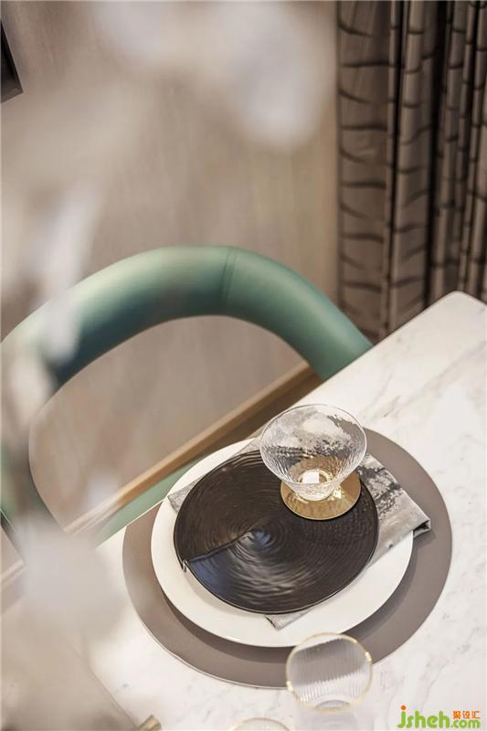 客廳作為空間交互的中心,大片落地窗與開(kāi)闊的陽(yáng)臺(tái),讓光線(xiàn)被最大化地保留。撲面而來(lái)的綠奠定了空間的清涼感,金屬元素以不同形態(tài)點(diǎn)綴在家具、燈飾的細(xì)節(jié)上,空間顯得更加清透、明澈。當(dāng)代都市人追求的綠洲情調(diào)隨著顏色和材質(zhì)的暈染,意境全開(kāi)。