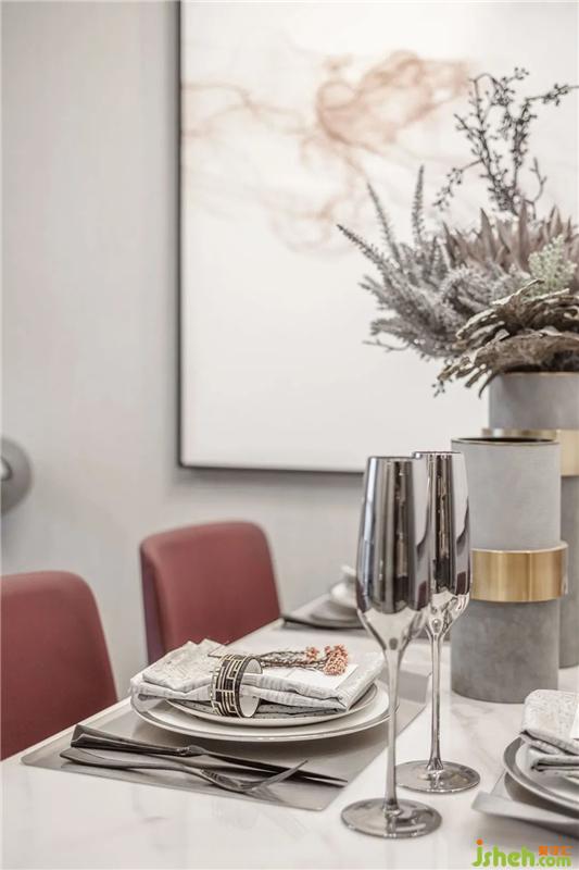 客廳的家具造型簡潔干練,主色調(diào)黑白灰點綴一抹灰紅,不失現(xiàn)代都市時尚感。清晨或午后慵懶的臥在沙發(fā)上,陽光透過玻璃灑下,為客廳投入?yún)⒉畎唏g的光影,靜影成壁,是那么令人沉醉。樣板房設(shè)計