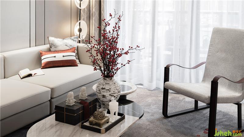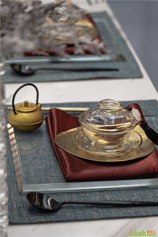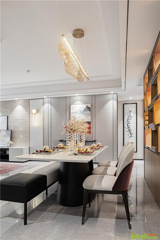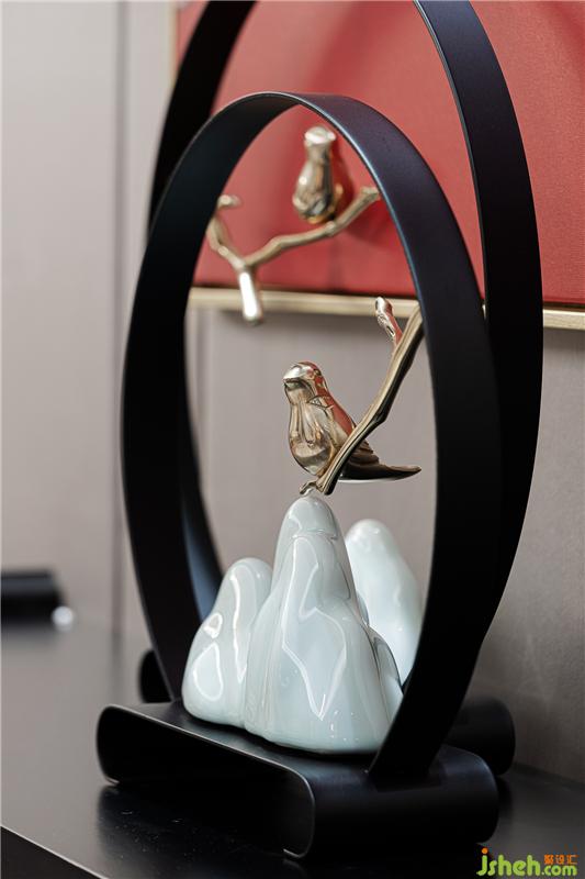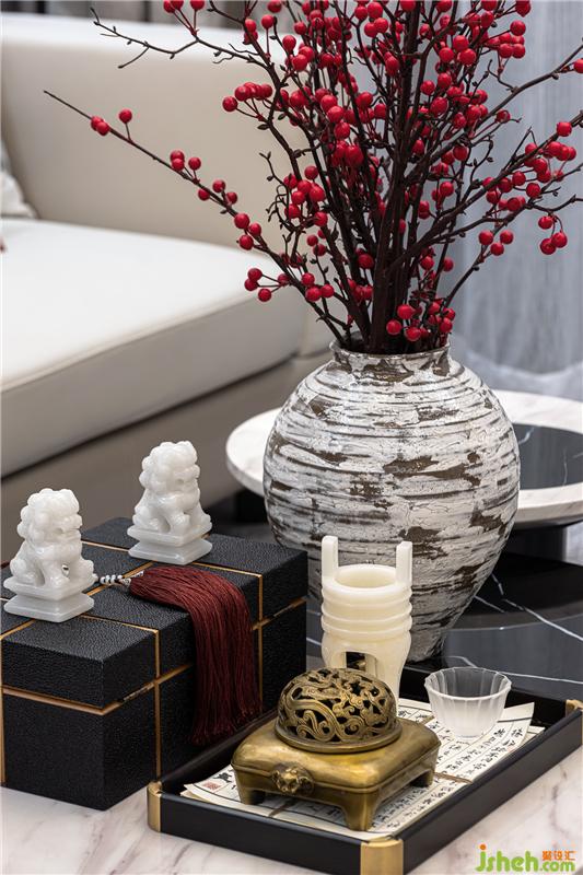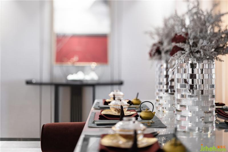 餐具、飾品結(jié)合整體風(fēng)格及空間氛圍,在自然光線與室內(nèi)燈光的點(diǎn)綴之下,更突顯品質(zhì)感,新中式格調(diào)的味道彌散在每一處細(xì)節(jié)。胡桃木與磚紅色搭配的端景臺(tái)點(diǎn)綴在入門盡頭,精美的畫作、氣韻生動(dòng)的倒流香擺件,整個(gè)空間更突顯悠韻綿長之感。