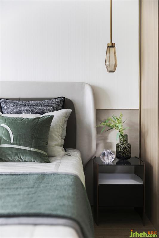 臥室是理性營造的積極生活所帶來的幸??臻g。我們?nèi)砸砸荒ňG意為主調(diào),以柔軟的布藝柔化空間的感覺,提升空間的舒適度。木地板細膩柔和的光澤感,仿佛是添加了一層柔光濾鏡,床頭垂掛兩只極具藝術感的燈具,更加突顯臥室的風情,溫暖而舒服的大床,自然在其中悄然演繹,與平靜有序的時光一同溫存出優(yōu)雅的韻味。