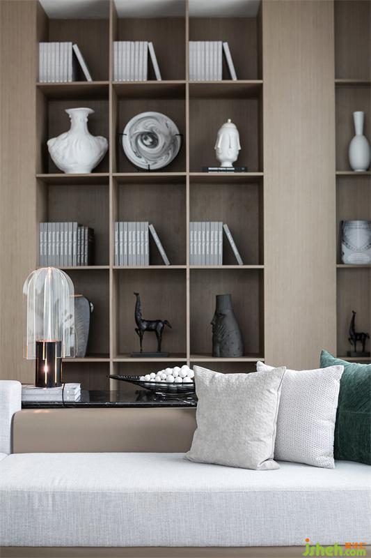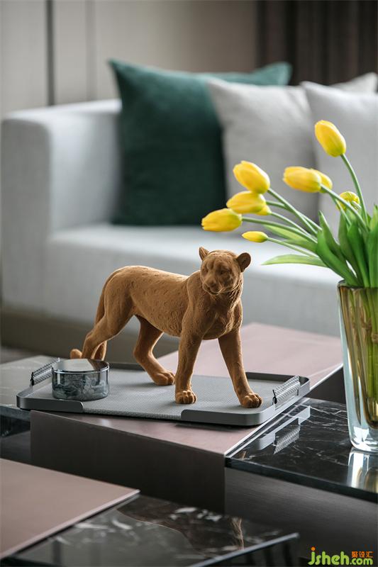 超大L型落地窗大客廳讓整個空間豪氣十足,盡情享受城市的天際線,24小時觀賞城市的發(fā)展與變遷。意大利MINATTI轉(zhuǎn)角組合沙發(fā)可以自由切換成會客聚會模式和家人閑坐燈火可親的合家歡模式。象征著與時間賽跑的“時光的腳印”掛飾,笑容可掬的獵豹模型,拍賣會收集的金屬象牙藝術(shù)品,剛剛?cè)计鸬墓虐脱┣眩饺缴鸹鹈绲那度胧诫娮颖跔t,整排存放藝術(shù)收藏品的展示柜,無不展示著主人的審美情趣和對藝術(shù)品投資的熱忱,腹有詩書氣自華的書卷氣與藝術(shù)合二為一。