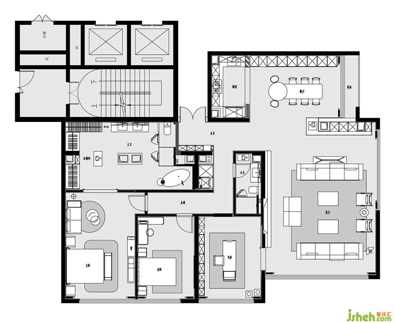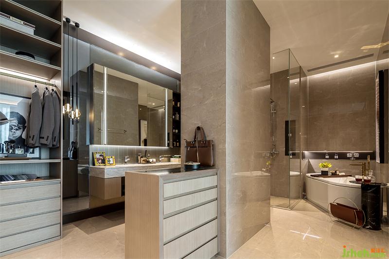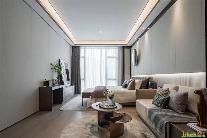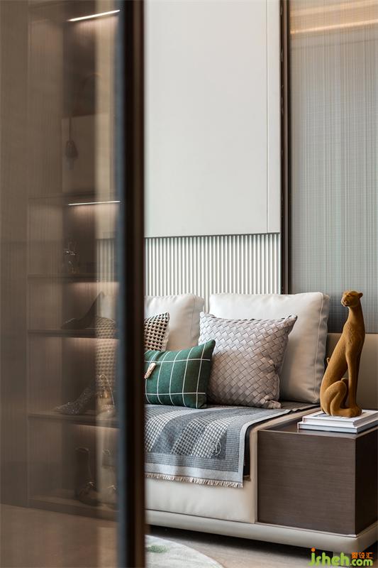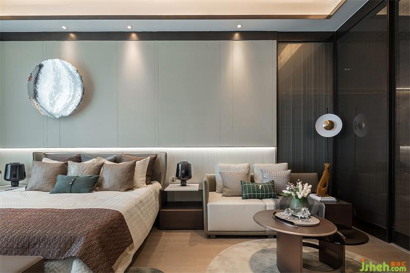 臥室的通道有兩條:一條穿過客廳書房,另一條則是從門廳直接轉(zhuǎn)角到達。主臥的空間足夠?qū)挸ǎ覀儗⑵浞譃闀蛥^(qū)、臥室區(qū)以及開敞式衣帽間和豪華衛(wèi)生間的大套房。整體空間樣板房設(shè)計從圖案色彩到材質(zhì)運用皆體現(xiàn)出雅致的意味。男主人睡前在沙發(fā)上瀏覽行業(yè)資訊,打個小盹,翻閱從瑞士帶回來的鐘表畫冊;女主人遞上愛馬仕羊絨毯,溫馨又甜蜜??恐罂堪?,兩個人在睡前交流各自的生活心得,偶爾俏皮的打鬧;抑或早晨的陽光透過綿密的紗簾一點點灑進來,她欣賞著他熟睡的樣子,親吻他迷人的輪廓......