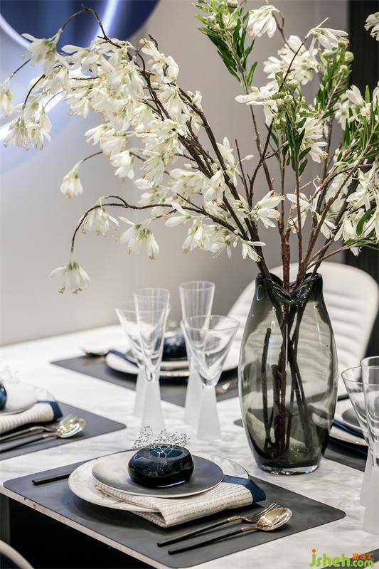東方文化的骨髓里都在強(qiáng)調(diào)對(duì)稱和儀式感,整齊劃一的餐具,對(duì)稱排列的餐椅,星星陣列的吊燈,在碧城色圓月型壁燈的照耀下,有種圓滿又回歸的悸動(dòng)。女主人精心準(zhǔn)備的姜花顯得格外的典雅和悠揚(yáng),畫面再現(xiàn)“漫空沙氣蜀姜黃,一角高城漏日光”的場(chǎng)景。