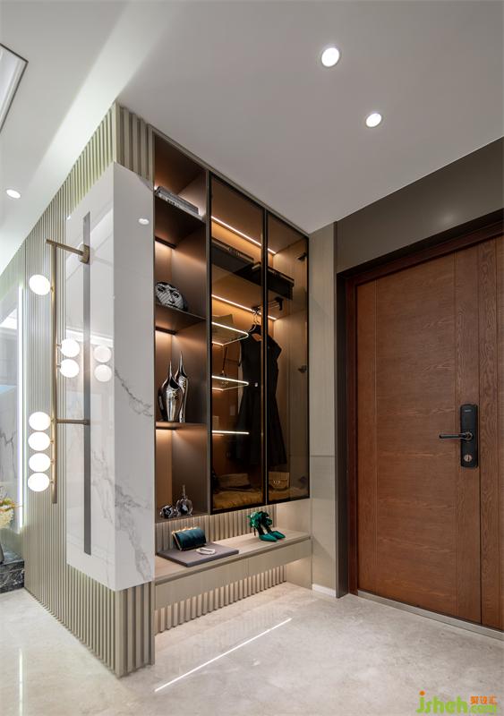 樣板間設(shè)計(jì)運(yùn)用黑白灰為主色調(diào),金色、綠色作為點(diǎn)綴色。玄關(guān)是進(jìn)入整個(gè)空間中的第一印象,也是主人職業(yè)特性的體現(xiàn),精致的服裝及珠寶,是受益于女主人的職業(yè)特征,精心為家而打造的,女主人是一個(gè)愛裝飾家的人,同時(shí)也給空間氛圍增加了儀式感和歸宿感。