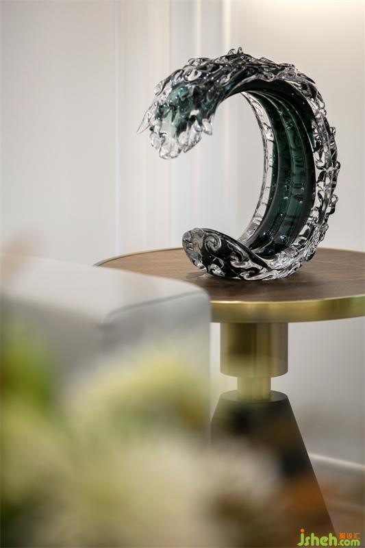 客廳在木質(zhì)墻面背景前搭配了一款現(xiàn)代淺灰色Minotti多人沙發(fā),和意大利高端品牌Molteni&C單人椅,加入異形拼接的地毯,使空間更具時(shí)尚感。吊燈的線條感與空間形成呼應(yīng)。掛飾裝置名為“環(huán)扣”,體現(xiàn)出男女主人共同的興趣愛好,環(huán)環(huán)相扣,勾勒出家的輪廓。