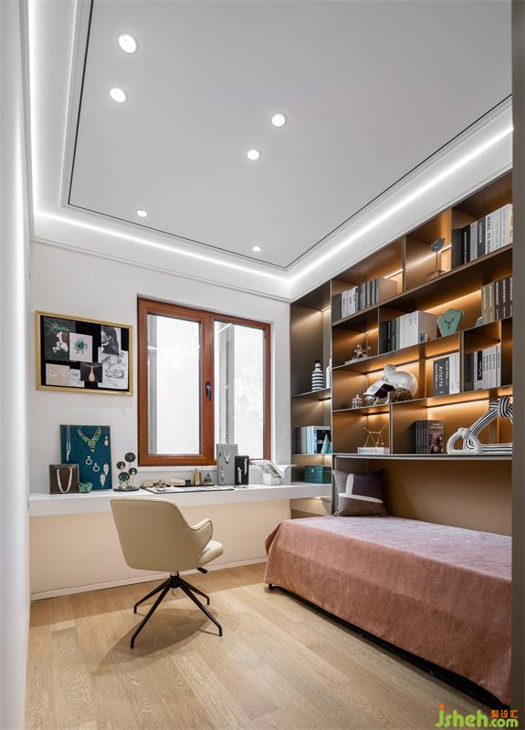 女主人是一名珠寶設(shè)計(jì)師,書房以人物的特性來進(jìn)行軟裝塑造,設(shè)計(jì)珠寶的手稿、珠寶成品展示、珠寶書籍等都是體現(xiàn)女主人的職業(yè)特性,同時(shí)也體現(xiàn)了女主人對(duì)生活高品質(zhì)的追求,以及潮流時(shí)尚的生活態(tài)度。