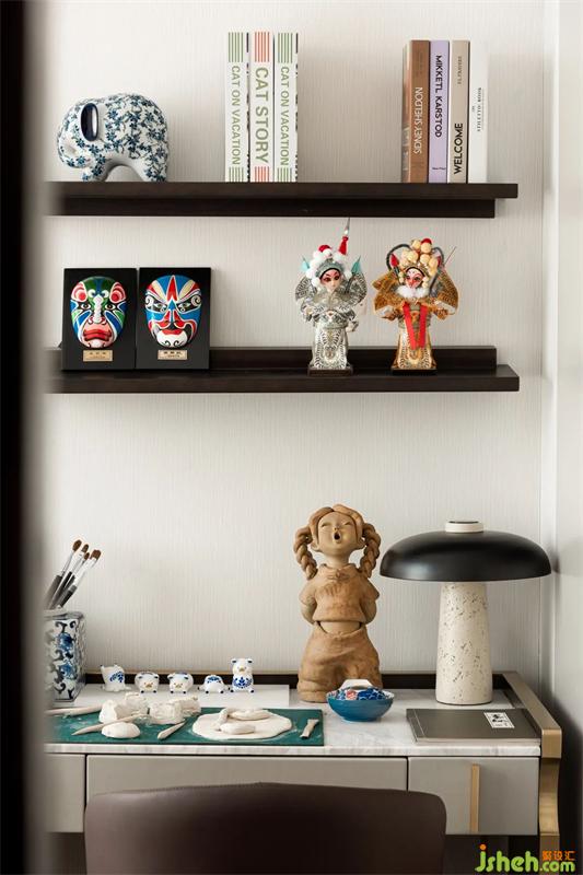 兒童房采用瓷器主題營造一個具有中國文化特色的兒童空間,同樣也是一種中國傳統(tǒng)文化的傳播與傳承。藍(lán)色與紅色的沖突對撞、刻意規(guī)避傳統(tǒng)空間單一化表達(dá)的乏味,陶瓷、臉譜與擺件的置入,趣意盎然,摹刻出情景感十足的畫面。