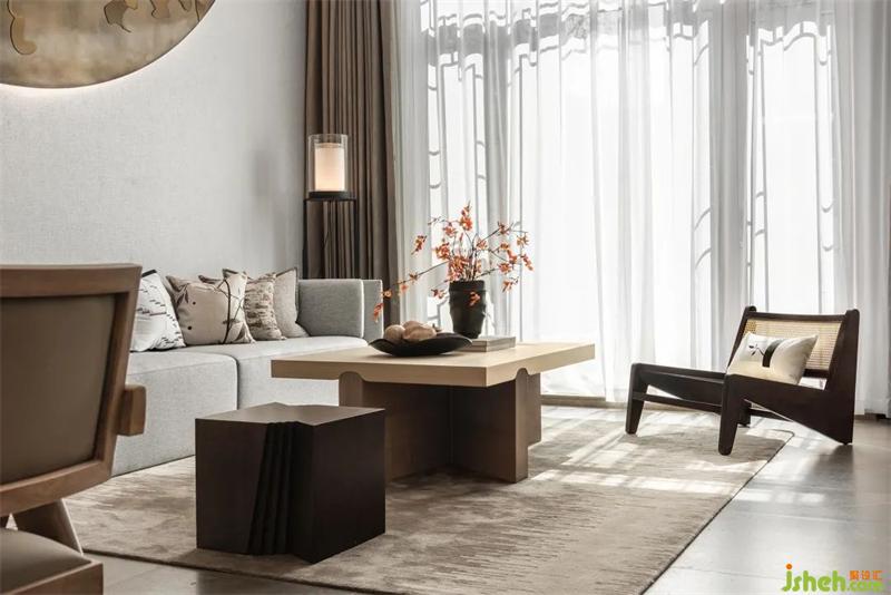 客廳單人沙發(fā)的樣式取形于雍仲本波佛教的吉祥標志——萬字,萬字在梵文中意為“吉祥之所集”,家具設計以簡單質樸的形式與取材,表現(xiàn)出自然樸拙的質感,令人感受到清靜寂定的氛圍。