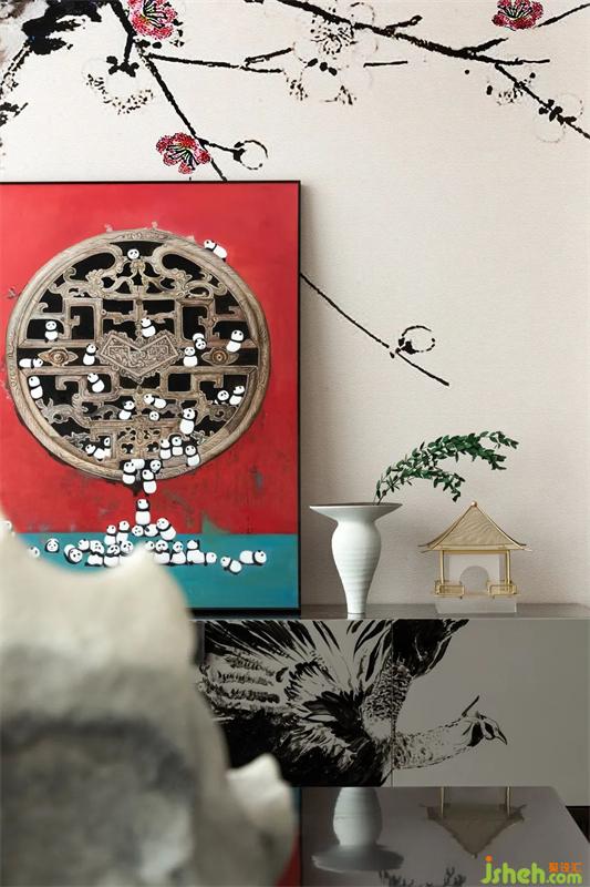 明代官吏常服盤領(lǐng)袍,胸前和后背綴有一方補(bǔ)子,區(qū)別品秩,孔雀是其中之一,樣板間設(shè)計(jì)運(yùn)用到電視柜上,水墨寫意,雅逸清俊。明朝給丹頂鶴賦予了忠貞清正、品德高尚的文化內(nèi)涵。結(jié)合這一元素運(yùn)用到軟裝的地毯上,灑脫秀逸,閑庭信步。