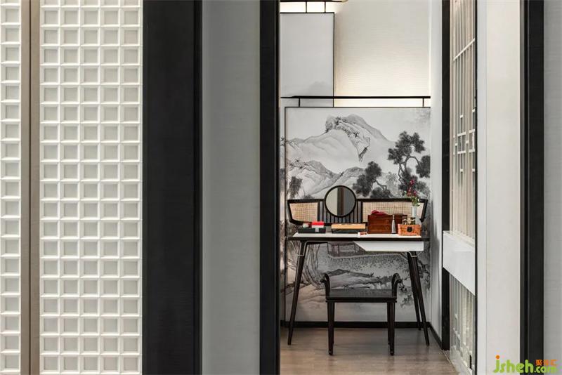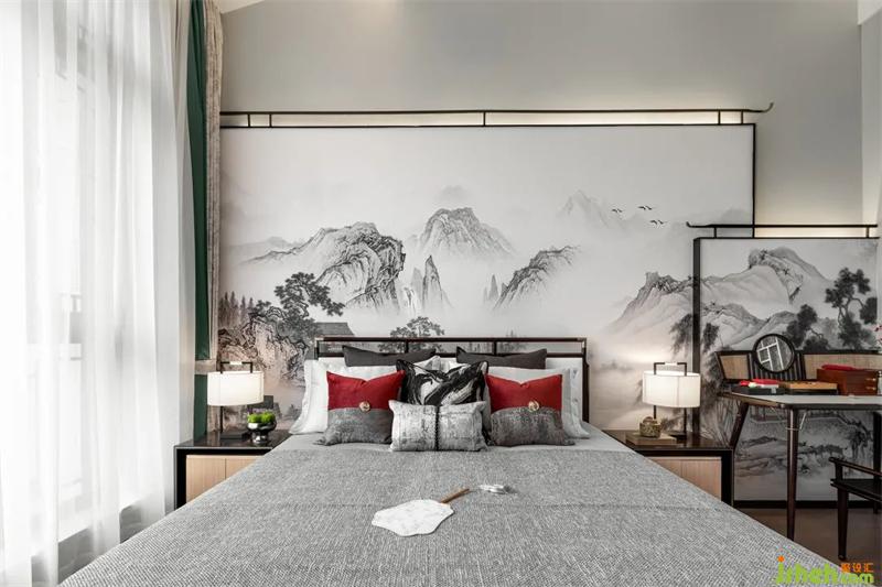 文人雅士的核心審美特點(diǎn)是“雅趣”,“雅”作為一種審美標(biāo)準(zhǔn)和設(shè)計(jì)思想貫穿于明代家具設(shè)計(jì)之中。家具線條直與圓弧結(jié)合,也是文人的傲骨之氣與婉約之風(fēng)的體現(xiàn)。主臥配色清雋風(fēng)雅,溫和的白與灰中庸地包容空間內(nèi)每一個(gè)細(xì)節(jié)。一簇?zé)艋?,一簾光影,深淺不一的紅點(diǎn)綴在空間各處,樣板間設(shè)計(jì)盡顯明代的古意與詩(shī)韻。
