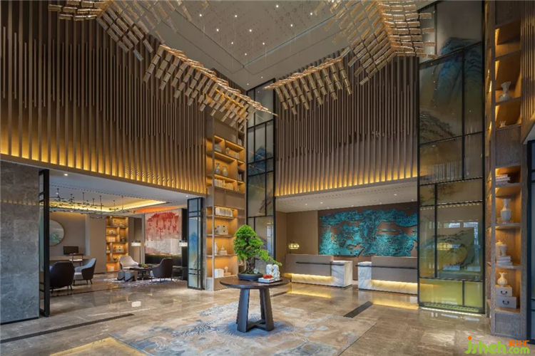 酒店大堂延續(xù)外立面的建筑元素,酒店設(shè)計(jì)將四合院的屋頂形態(tài)藝術(shù)化的表達(dá),運(yùn)用現(xiàn)代的琉璃材質(zhì),塑造現(xiàn)代的時(shí)尚與輕奢感。墻面自然元素的屏風(fēng)與木格柵,營(yíng)造現(xiàn)代簡(jiǎn)潔的和諧之美。