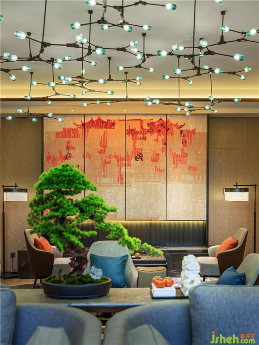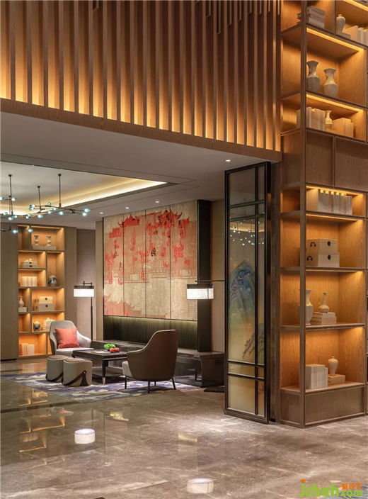 定瓷作為宋代五大名窯之一,酒店設(shè)計(jì)師以軟裝陳設(shè)的方式,融入空間柜架中,將傳統(tǒng)建筑、自然、藝術(shù)品相融合,營(yíng)造出自然、輕雅的城市人文驛站。